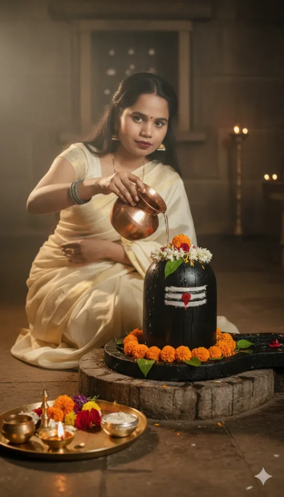 A cinematic, ultra-realistic photo of a traditional Hindu woman performing a sacred ritual at a temple. She is (use uploaded face) wearing a cream-colored Traditional Saree, is pouring water by knee down slightly from a copper pot over a big black Shiva Lingam emerging from ground, decorated with flowers, chandan sindoor tikka, beside of shiv ling there is a brass plate filled with flowers and offerings. Creating a serene and spiritual atmosphere.