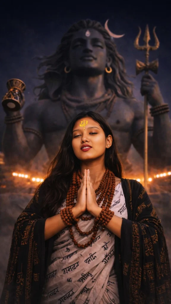 Create a devotional cinematic portrait of a young indian woman standing in front of a giant lord shiva statue at an outdoor temple location the woman is centered in the frame with both arms stretched wide upward in surrender eyes closed, face lifted slightly toward the sky, showing deep devotion and peace. She is wearing a white saree printed repeatedly with "ॐ mahakal" text, layered with multiple rudraksha bead malas around his neck. a black shawl with a sanskrit and