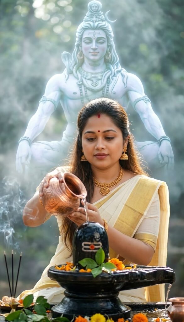 A hyper-realistic cinematic portrait of a beautiful Indian woman with a serene expression, performing Abhishekam by pouring water from a copper kalash onto a sacred black Shiva Lingam. In the backgroundlarge, ethereal, and translucent glowing spirit of Lord Shiva in a meditative pose emerges through soft mystical mist. The woman is dressed in a traditional Kerala Kasavu saree off-white with a gold border wearing elegant gold jewelry including jhumkas and a necklace.