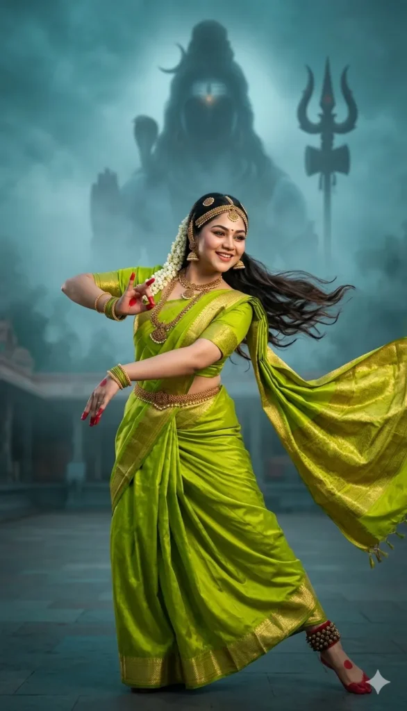 for this image* A hyper-realistic cinematic shot of a graceful Indian woman performing a classical dance pose, wearing a vibrant lime-green silk saree with a golden border. Her hair is flowing mid-motion, adorned with traditional jewelry and a jasmine flower garland (gajra). In the background, a massive, ethereal and misty silhouette of Lord Shiva looms with a glowing third eye and a majestic trishul (trident).