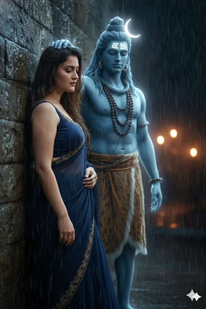 A cinematic, ultra-realistic image of a woman (face matching the uploaded photo) wearing a dark blue gown, leaning against a damp stone wall in the rain. SHe looks down with a sad, emotional expression. Beside him, a translucent, glowing blue spiritual figure resembling Lord Shiva (with a crescent moon in his matted hair and a third eye on his forehead) places a comforting hand gently on the woman’s chest. The atmosphere is dark and rainy, with a blurred, warm orange