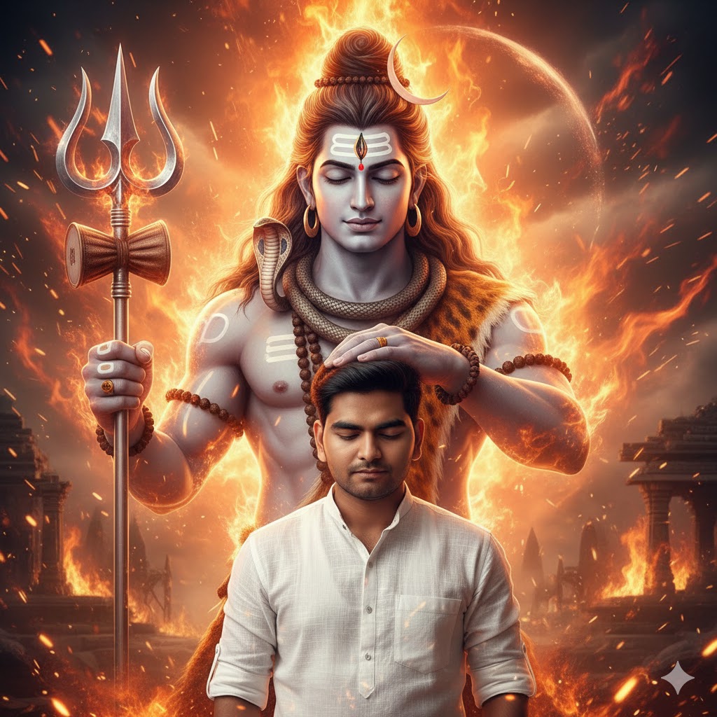 A cinematic, ultra-detailed divine portrait of a young Indian man standing calmly in the foreground, wearing a textured white shirt and wristwatch, looking downward peacefully. Behind him appears a gigantic, glowing Lord Shiva in fiery aura, holding a trident, long flowing hair, crescent moon on head, and intense glowing eyes. Shiva’s hand is placed gently over the man’s head as a blessing gesture. Background filled with flames, sparks, and spiritual energy particles. Dramatic lighting, orange fire glow, photorealistic skin texture, depth of field, 8K resolution, mythological atmosphere, powerful spiritual mood, high contrast, sharp focus, epic devotional composition.