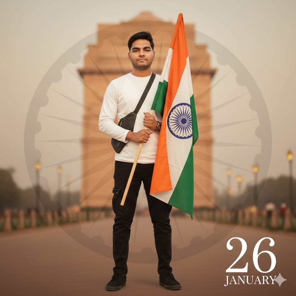 Ultra-realistic minimal patriotic portrait of the uploaded Indian boy standing calmly, holding the Indian tricolor flag vertically. Clean white long-sleeve T-shirt, black cargo pants, black sneakers, sling bag. Softly blurred India Gate background, very subtle Ashoka Chakra texture, warm cinematic lighting, shallow depth of field, 8K DSLR clarity. Elegant tricolor 26, “JANUARY” in thin premium serif font with soft blur.