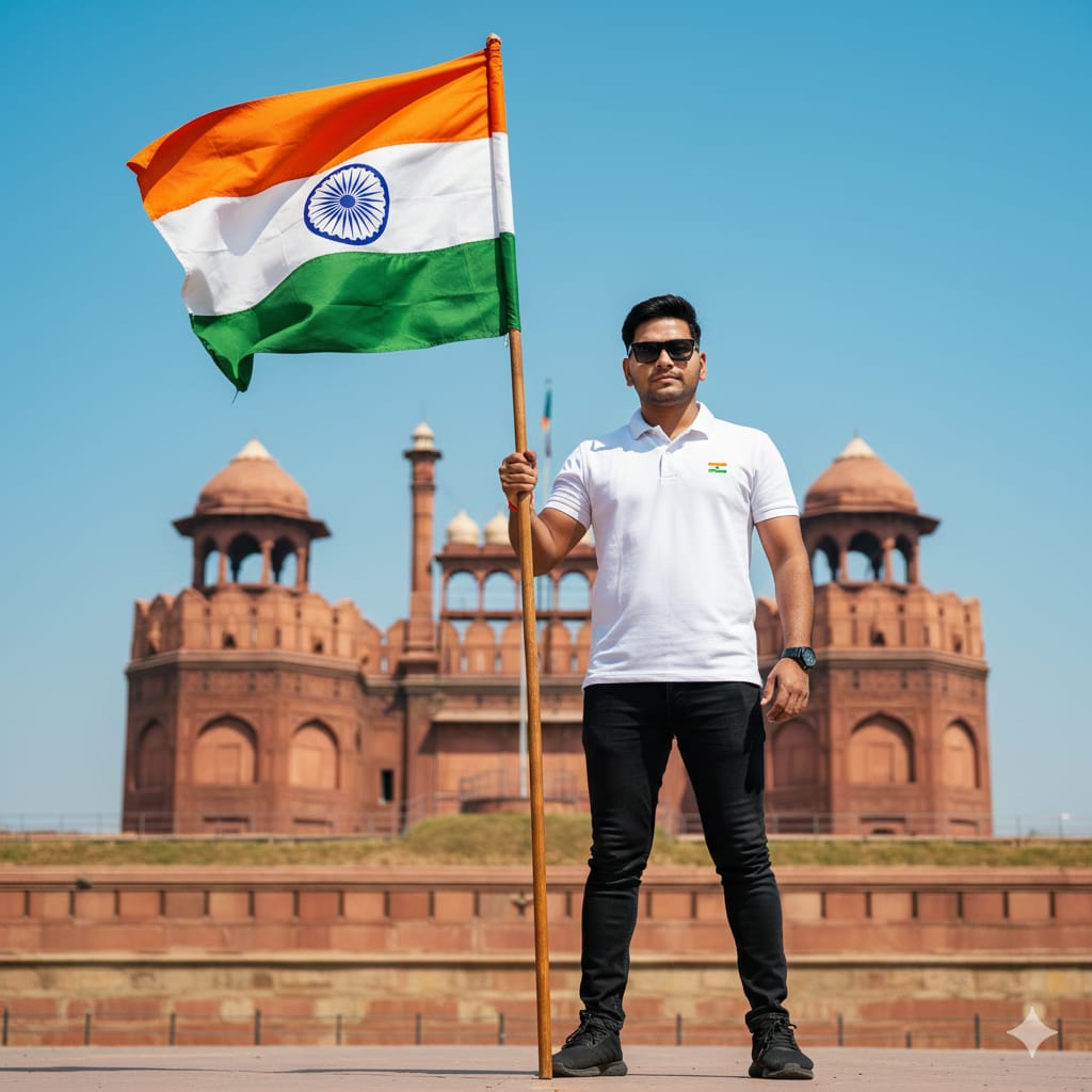 A cinematic, high-quality full-body shot of a man standing heroically in front of the Red Fort (Lal Qila) in Delhi during a bright sunny morning around 10-11 AM. The man is wearing a crisp white polo shirt with a small Indian flag logo on the pocket, black denim jeans, and branded black sports shoes. He is wearing stylish black sunglasses. He is holding a very large Indian National Flag attached to a long wooden stick, with the flag waving majestically in the wind. In the background,