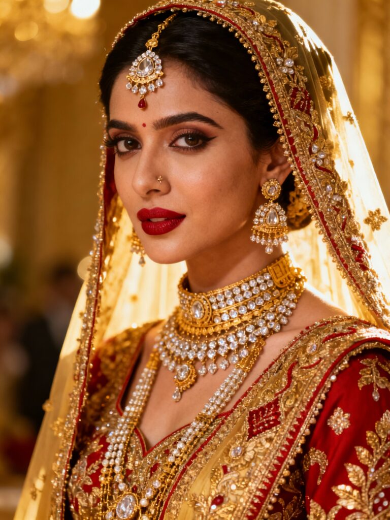 “Create an Indian royal wedding-style portrait with bright gold lighting, luxury embroidery details, premium jewelry shine, cinematic depth, ultra-realistic bridal facial features.”