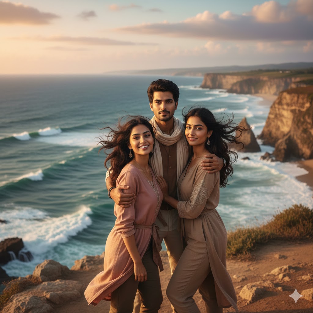 “Create a realistic travel portrait on a cliffside with warm sunlight, wind-blown hair effect, sharp details, nature-rich background, DSLR-style clarity, adventure photography feel.”