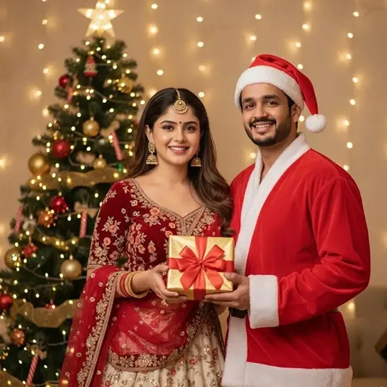 A festive Indian couple celebrating Christmas together. The woman is wearing a traditional red and cream lehenga with floral patterns,