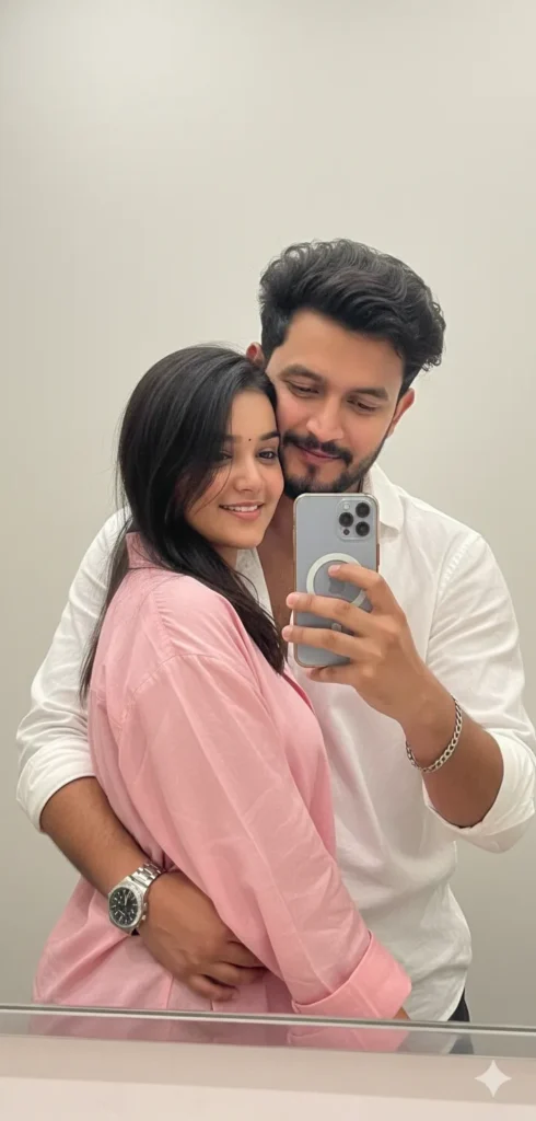 A romantic Indian couple, (use refrence image) Ultra -realistic a selfie portrait of couples in front of a plain or softly-lit background. Hold your phone in one hand so it’s visible in the mirror, showing your wristwatch or bracelet clearly man is wearing a white loose shirt And woman is wearing a pink loose shirt, and make sure your face is partially covered by your hair for a casually stylish look.boy one hand holding girl back. Keep 100 percent same