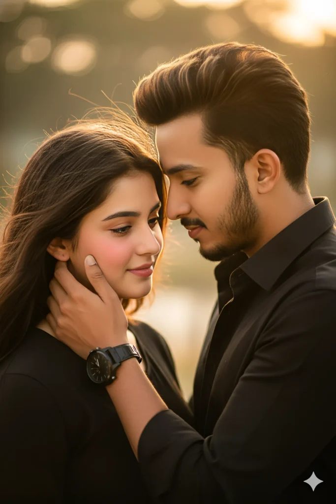 Create a cinematic romantic portrait of a beautiful young couple, with the girl leaning close with a soft blush on her face. Both the boy’s and the girl’s faces should match exactly the same as the reference image. The boy is gently touching her cheek, with intense eye contact between them. The atmosphere should be passionate, with warm golden lighting, shallow depth of field, and soft skin glow. Their slightly