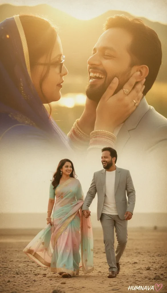 “Ultra-romantic cinematic double-exposure poster featuring the man (face 100% identical to reference) and his partner. Layer 1: Soft close-up — woman holding his face as he laughs in golden sunlight, dreamy glow. Layer 2: Blended full-body scene — couple walking outdoors on sandy ground; woman in pastel saree, man smiling, light breeze, romantic vibe. Signature ‘humnava’ elegantly placed.”