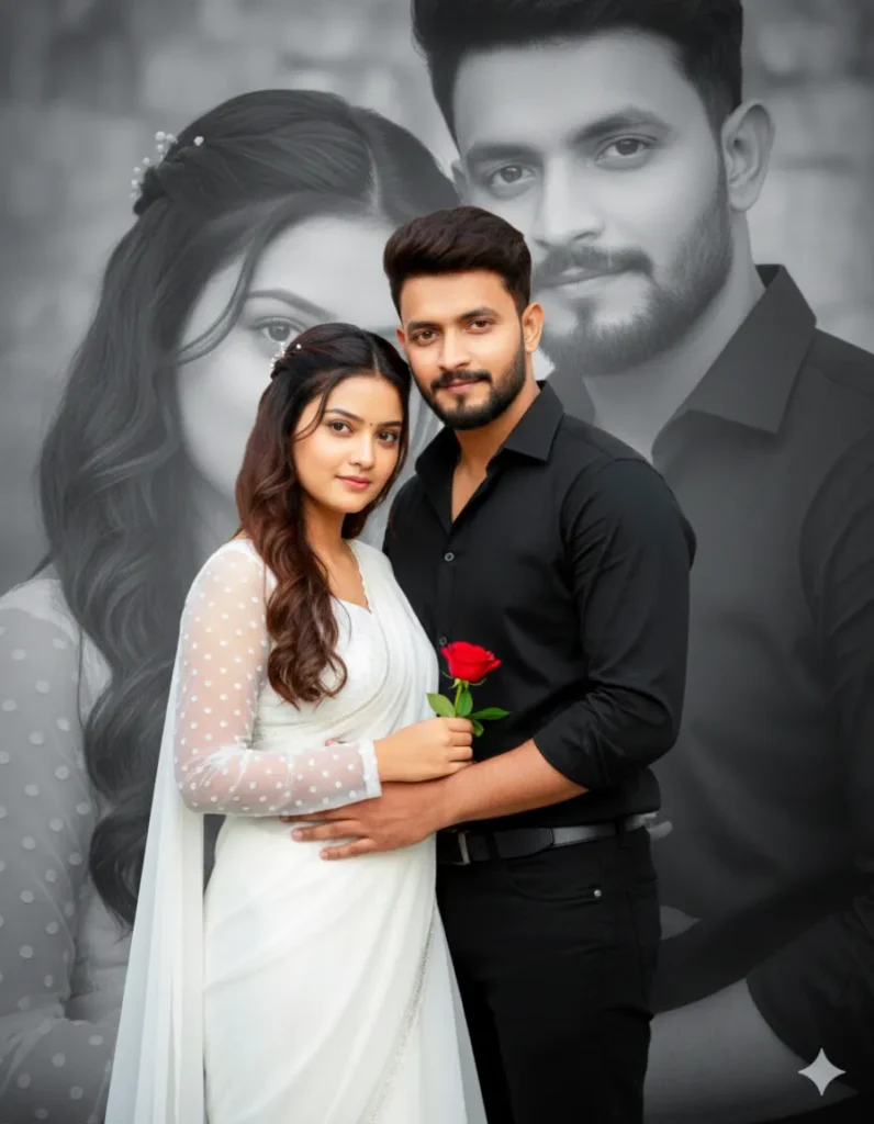 “Ultra-realistic cinematic couple portrait; a woman in a white saree with sheer polka-dot sleeves and soft flowing pallu, standing close to a man in a black modern shirt and black pants; she holds a single red rose while he gently holds her waist; both are looking directly at the camera with sharp natural faces and a soft romantic expression woman has long wavy hair with tiny floral clips; full-body shot; background features large black-and-white faded portraits of both in a