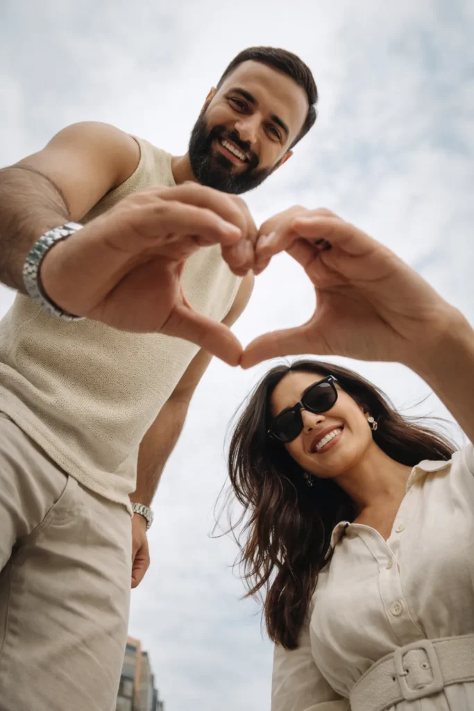 Silhouette of romantic couple forming heart shape with hands, glowing neon heart light behind them, dark background, dramatic lighting, cinematic mood, ultra sharp edges, modern romaTransform this image [Upload Your Image] into a 64K DSLR shot resolution of A creative, low-angle lifestyle photograph of a couple standing outdoors, captured from ground level looking upward toward the sky. A young man (same face as the uploaded image) and woman lean toward each other from opposite sides of the frame, smiling warmly as they form a heart shape together with their hands in the center of the composition. Their fingersntic aesthetic, depth of field, emotional love concept, professional photography composition, high contrast colors, Valentine theme, highly detailed, 8K ultra HD clarity.