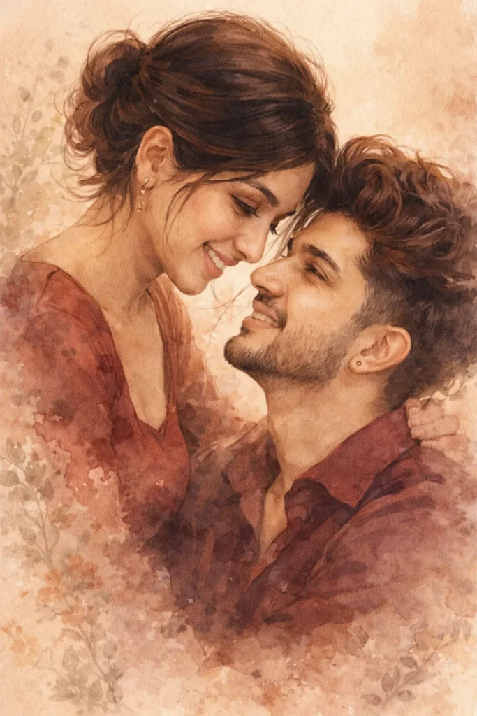 Close-up romantic portrait of coupA romantic watercolor-style digital illustration featuring a young couple in an intimate close-up. The woman has dark hair styled in a messy low bun with loose strands and small gold earrings, smiling warmly as she leans toward the man. The man has thick curly hair, a trimmed beard and is wearing a wine-colored shirt, smiling back at her. Their faces are very close with loving eye contact. The artwork uses soft painterly brush strokes, subtle ink outlines, warm muted beige and brown